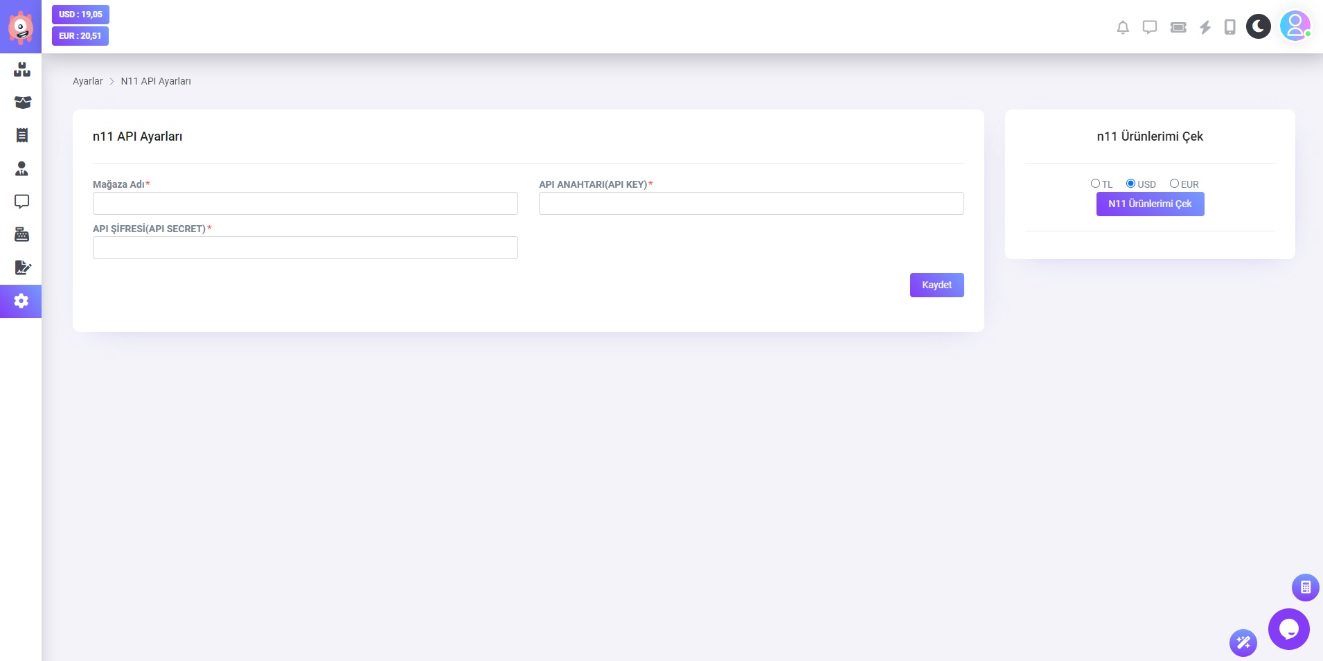 Dilerseniz "n11 Ürünlerimi Çek" butonunun hemen üstünde bulunan TL - USD - EUR seçeneklerinden kur endeksli ürün bilgisi çekebilirsiniz. (n11 üzerinde TL olarak gözükür. Sistemde USD/EUR olarak gözükür ve sürekli olarak güncel USD/EUR kurundan otomatik olarak güncellenir)
