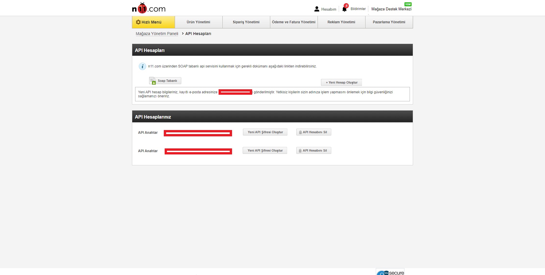 "Yeni Hesap Oluştur" butonuna basıldıktan sonra API Anahtarınız alt kısımda oluşacaktır. API Şifreniz n11 sistemine kayıtlı e-mail adresinize gelecektir.