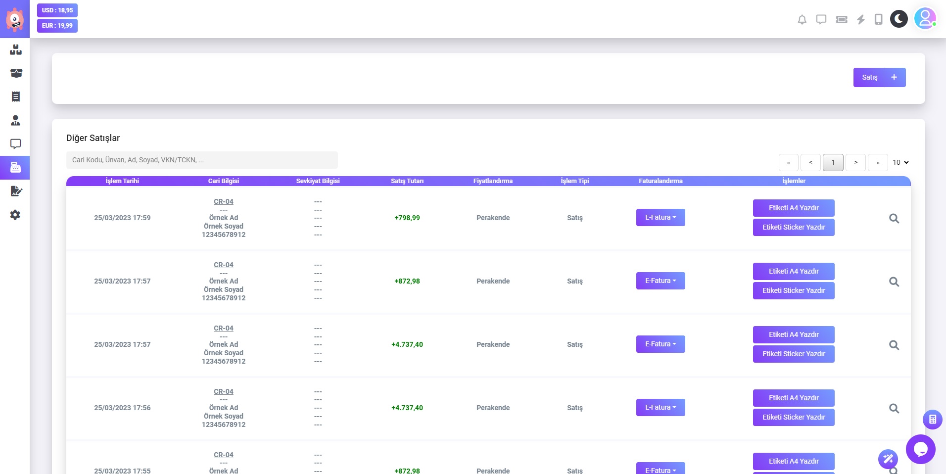Diğer Satışlar sayfasında "E-Fatura" kes butonuna basarak otomatik olarak fatura kesebilirsiniz. Karşı taraf E-fatura mükellefiyse otomatik olarak E-fatura değil ise E-arşiv fatura otomatik olarak kesilecektir.