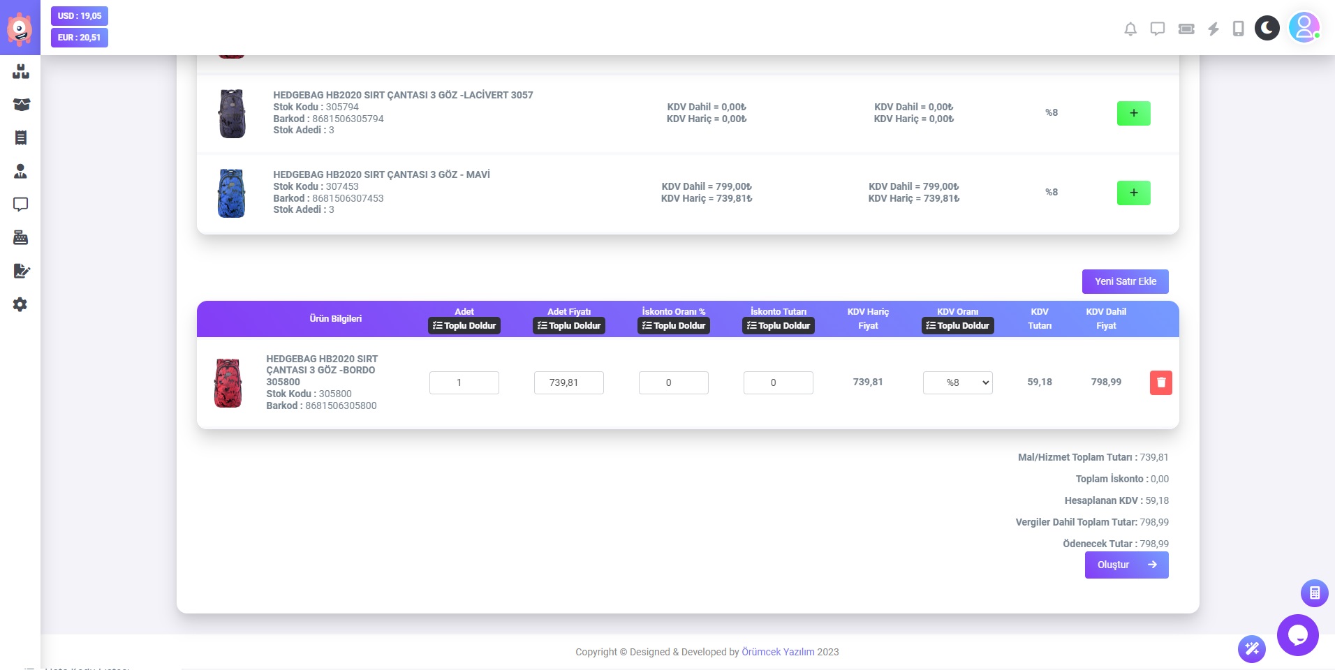 Satış işlemini tamamlamak için "Oluştur" butonuna basarak işlemi tamamlayabilirsiniz.