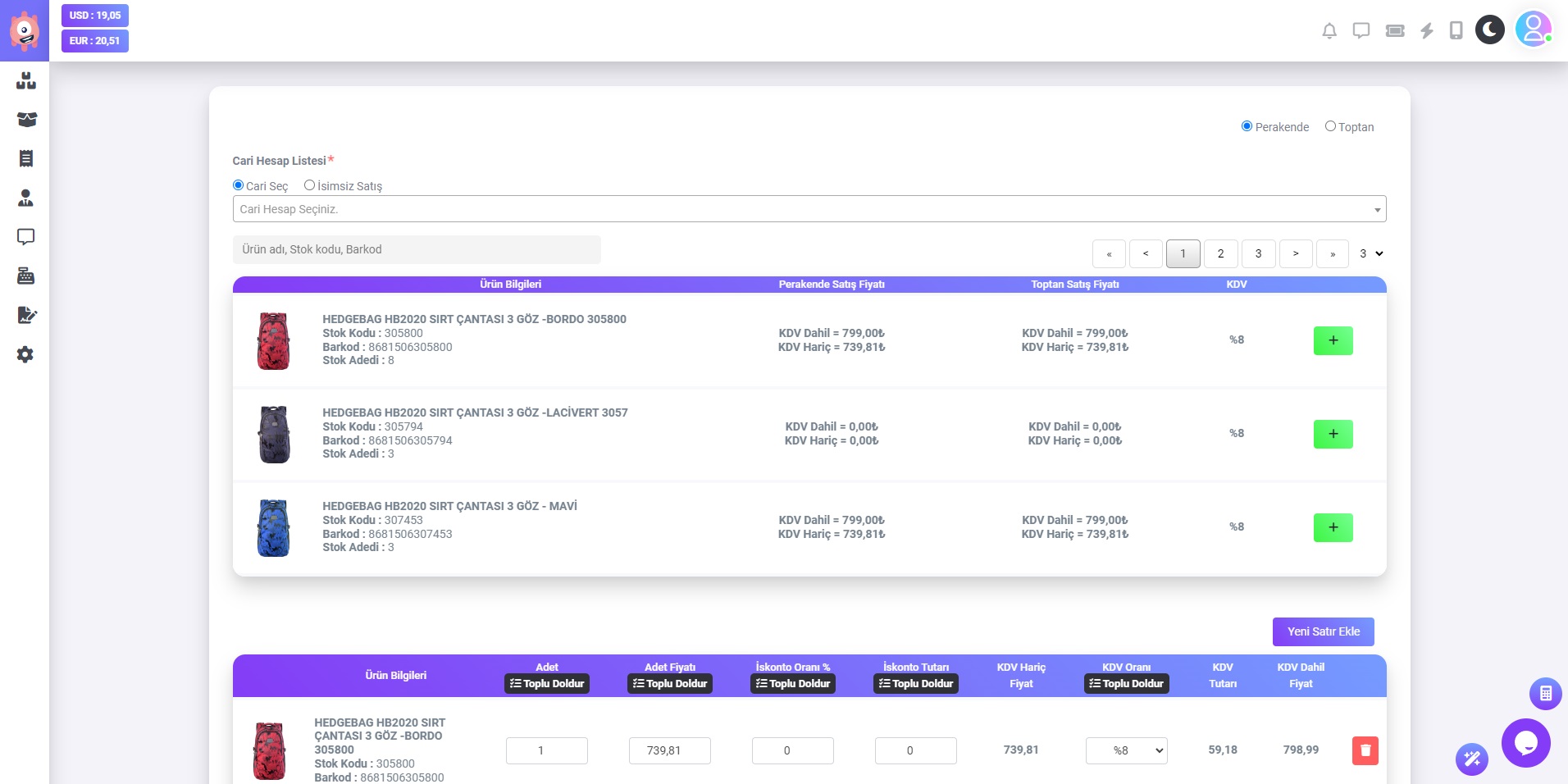 Satış işlemini gerçekleştirebilmek için ürün listenizden satılan ürünlerin yanındaki "+" butonlarına basarak satış(aynı zamanda fatura) satırlarınızı ekledikten sonra sağ üst kısımda bulunan Perakende/Toptan seçeneklerinden fiyatlandırma seçeneğinizi değiştirebilirsiniz (Perakende seçiliyse ürünün perakende fiyatları, Toptan seçiliyse ürünün toptan fiyatları seçili kalemlere uygulanacaktır).
